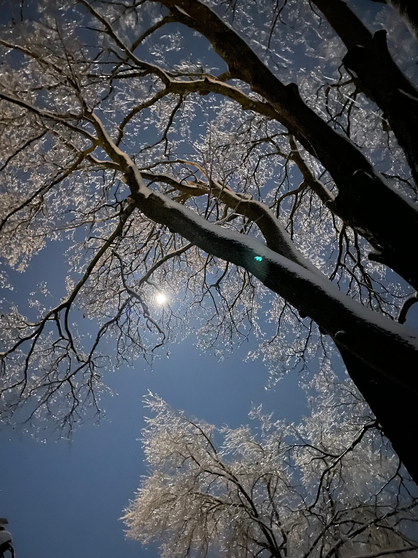 Old maple, we bless your shade. Underneath your branches, we play all summer, cool and protected. In fall we rake and rake, jump and jump. We gather leaves to dip in beeswax, weave crowns for our heads from your glory. One winter night, awake with the baby, I stepped outside to see the full moon reflecting off of your ice-coated limbs.